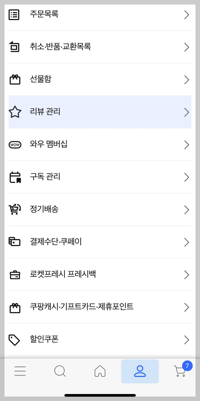 체험단 신청은 나의 정보로 들어가서 스크롤을 아래로 내리면 위와 같은 항목들이 뜹니다. 그중에서 '리뷰 관리'로 들어가시면 세 가지 항목이 뜨는데, 세 번째 항목인 '쿠팡체험단'을 선택하시고 원하는 상품을 선택해 체험 신청을 하면 됩니다.